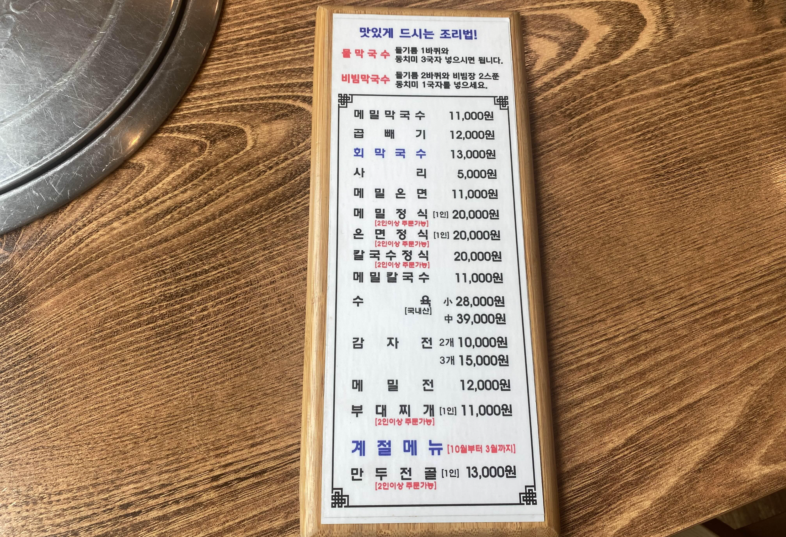메밀 막국수가 맛있는 집. 메밀이 80% 정도 함량되어 있어, 적당히 쫄깃한 맛을 자랑한다. 보쌈과 감자전, 막국수 등으로 구성된 메밀보쌈정식은 가격이 매우 저렴하고 양이 푸짐해, 가장 인기 있는 메뉴이다.